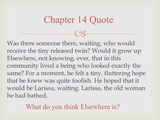 Chapters 19 and 20 analysis. LitCharts assigns a color and icon to each theme in The Giver which you can use to track the themes throughout the work. The giver chapter 2 summary quotes instructor.